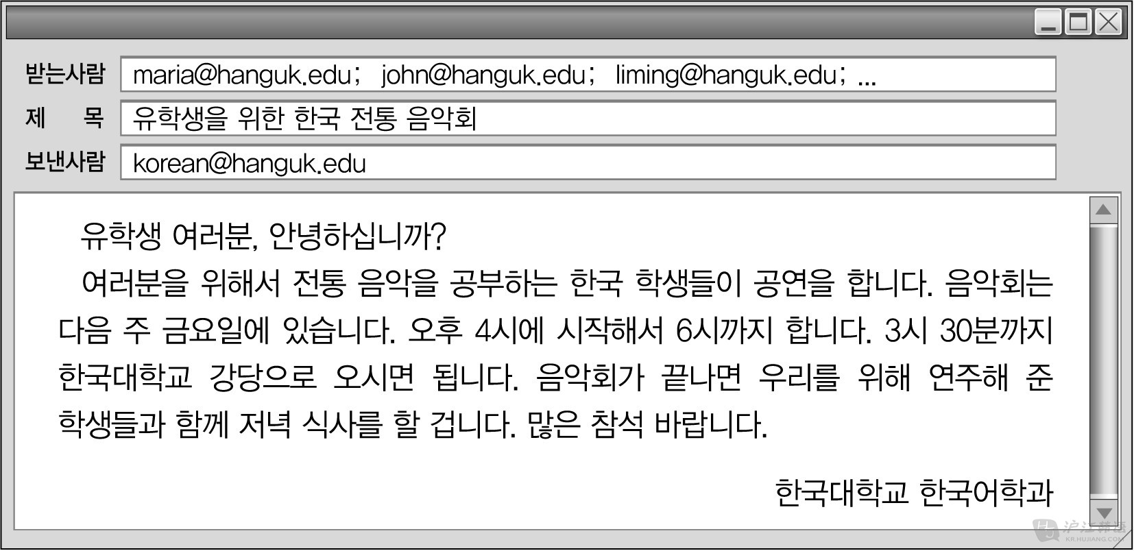 学习传统音乐的学生们为大家准备了演出。音乐会在下周星期五举行。下午4点开始,6点结束。3点30分之前来韩国大学的礼堂就可以了。音乐会结束后会和演出的学生们一起吃晚饭。希望大家踊跃参加。